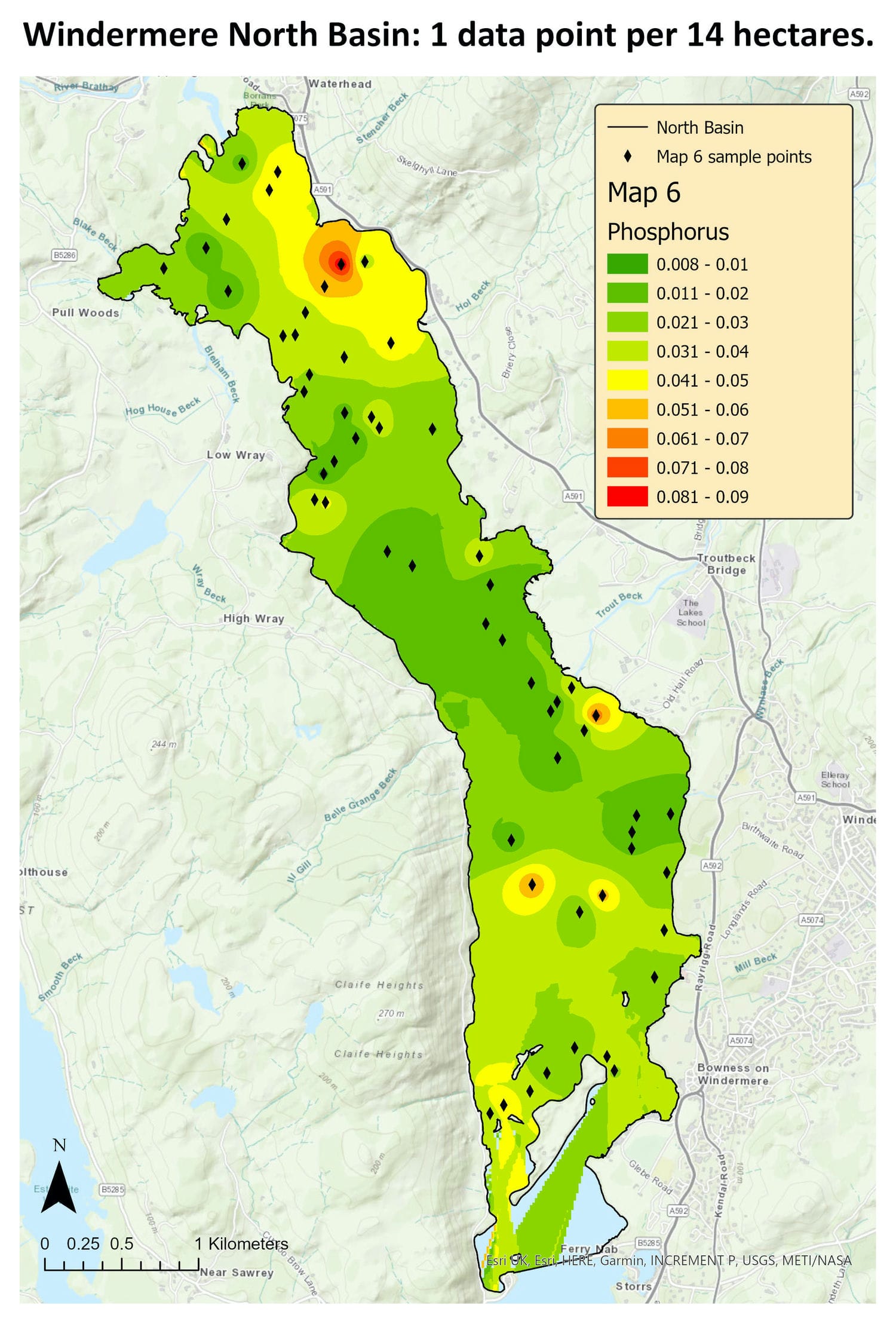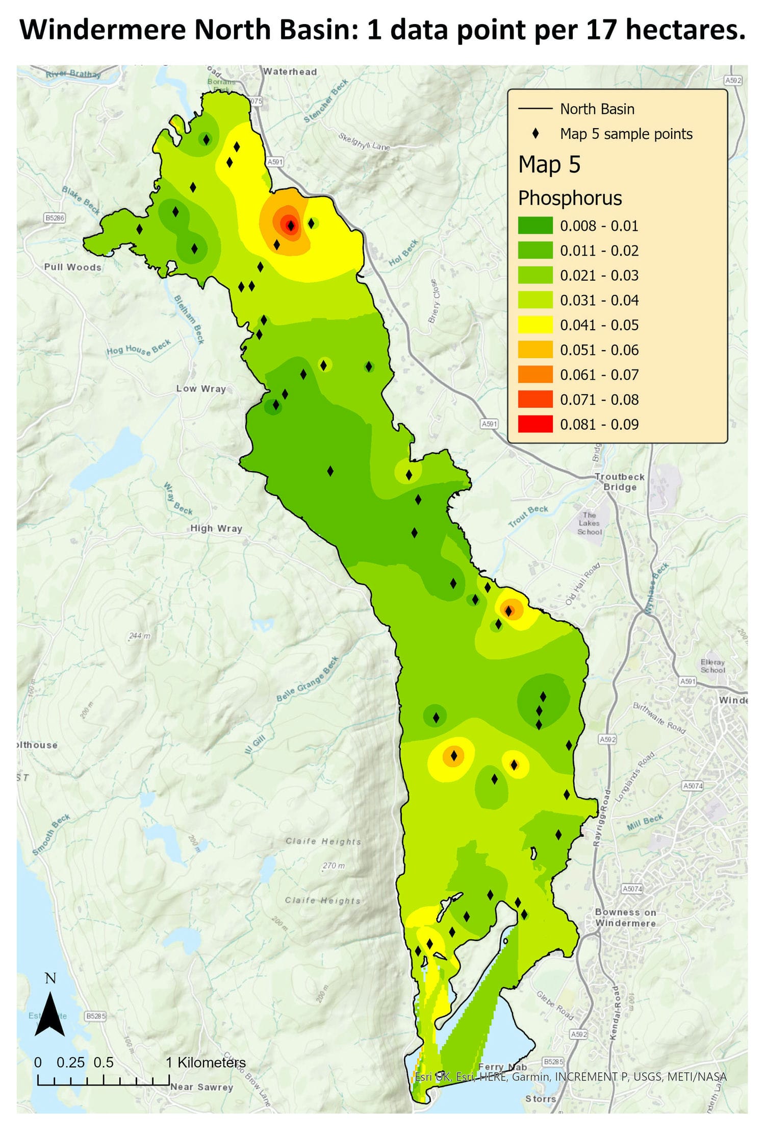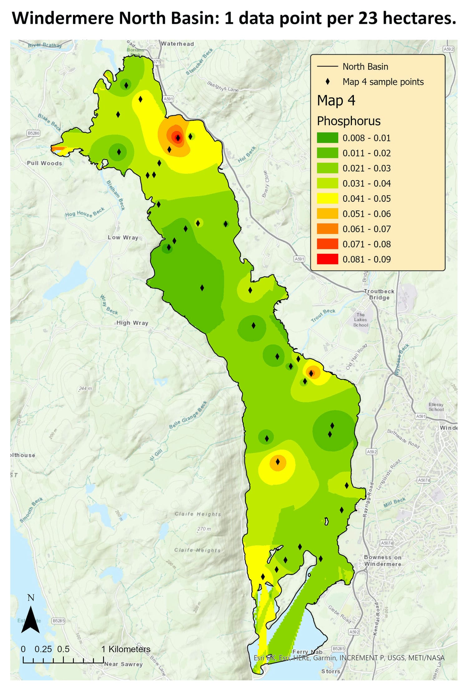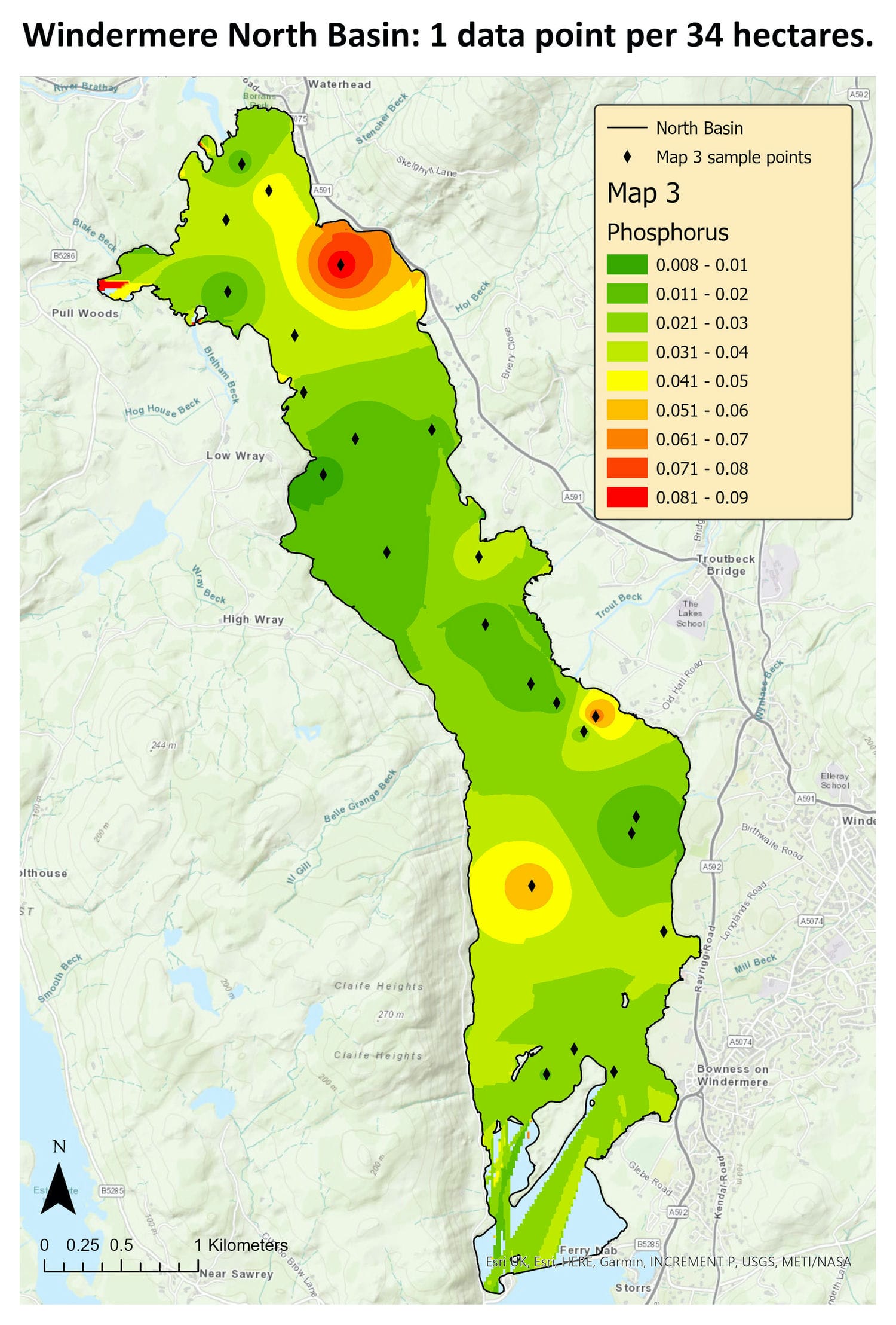 The results show that shoreline data alone was unrepresentative of the wider basin and that increasing sampling resolution significantly improved the spatial understanding of phosphorus concentrations in the Windermere North Basin. GIS maps produced from progressively larger datasets showed that low sampling densities resulted in substantial variation in predicted phosphorus distribution. However, from one data point per 23 hectares onwards, the spatial pattern stabilised, with minimal change observed in higher resolution models. This suggests that a sampling density of approximately one data point per 23 hectares is sufficient to provide an accurate representation of phosphorus concentrations across the North Basin.